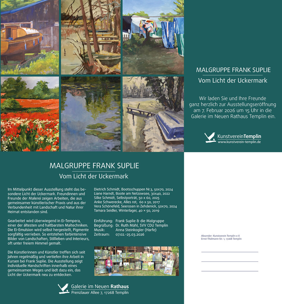 Die Künstlerinnen und Künstler treffen sich seit Jahren regelmäßig und vertiefen ihre Arbeit in Kursen bei Frank Suplie. Die Ausstellung zeigt individuelle Handschriften innerhalb eines gemeinsamen Weges und lädt dazu ein, das Licht der Uckermark neu zu entdecken.